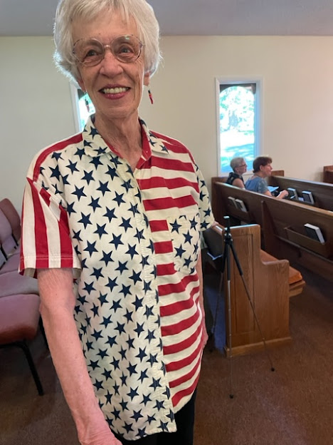 My friend, Diane, in a fabulous American shirt. But wait...what's that hanging from her ears?